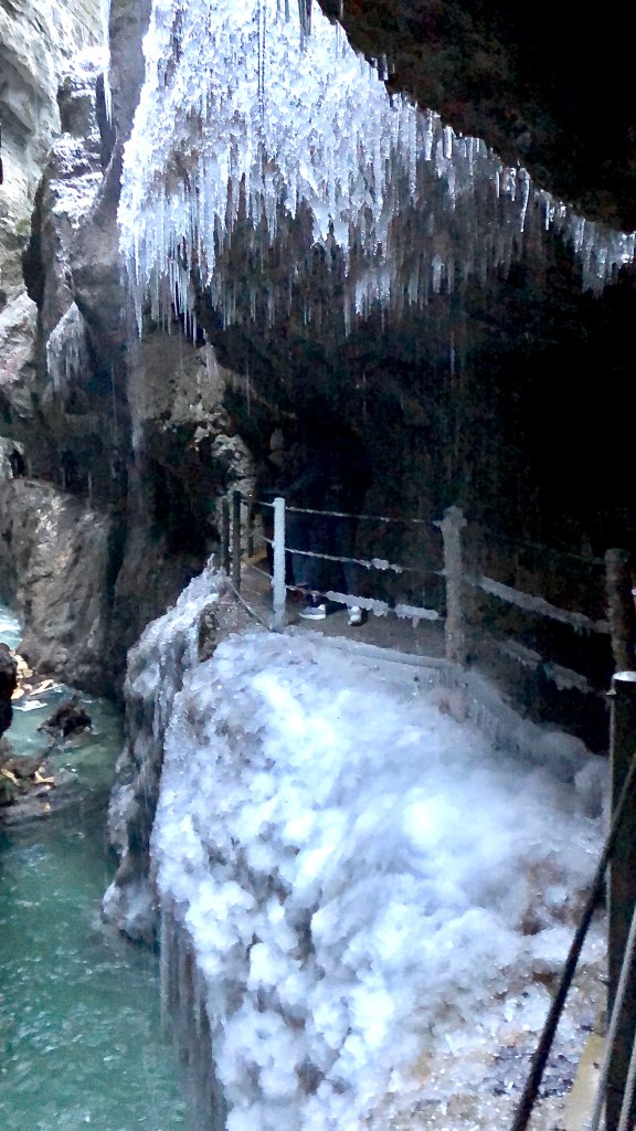 Der Weg ist zwar abgesichert, dennoch kann es schon ziemlich eng werden, da Gruppen dir entgegenlaufen und die Wegbreite max. 1m ist. Seid vorsichtig und steht nicht unbedingt unter den Eiszapfen. Ich war grad dabei weiterzulaufen, bis ich einen Schlag hörte und ich vor starr stehengeblieben bin, da ich nicht zuordnen konnte was da eben passierte. Dabei war es ein riesen Eisblock der von oben in den Fluss stürzte.